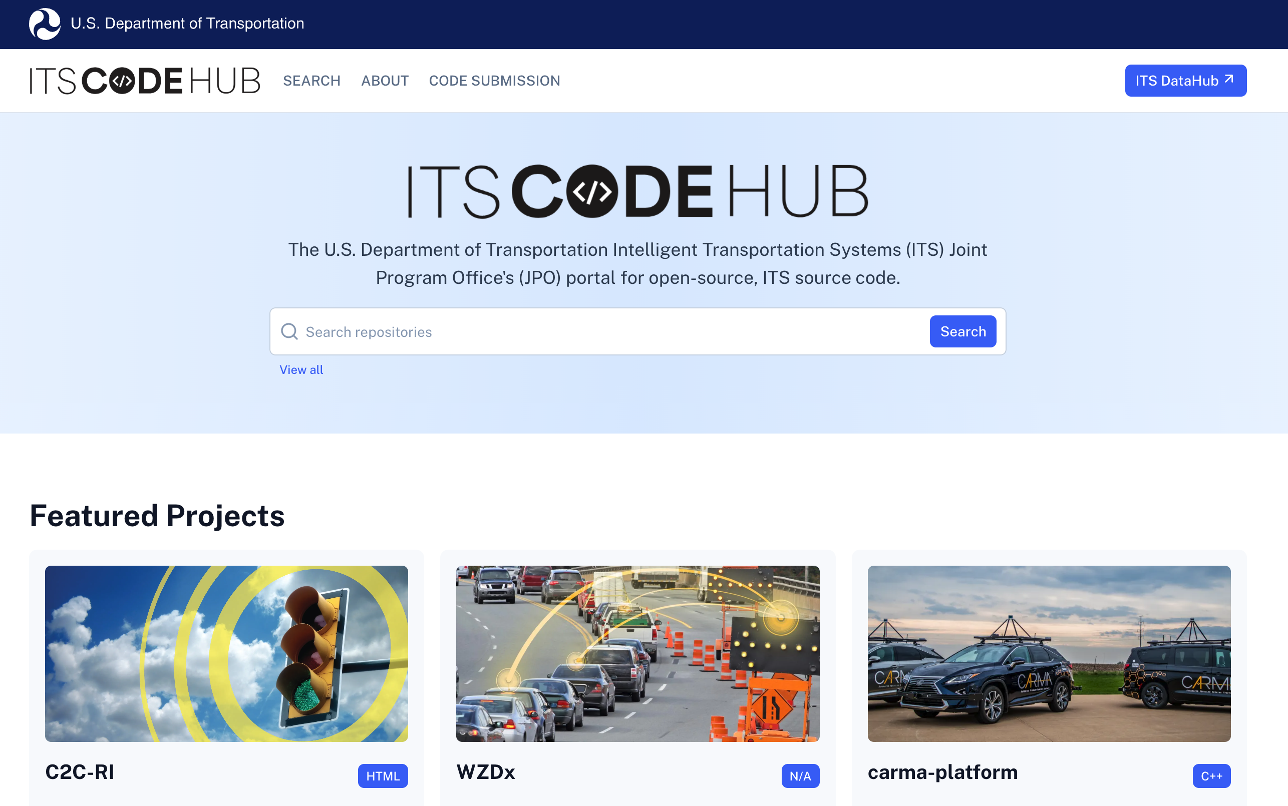 ITS CodeHub provides a single point of entry to discover the U.S. Department of Transportation's (DOT) publicly available open source code funded by the ITS JPO. Through ITS CodeHub, you can search for hundreds of open source repositories that have been made available by the ITS JPO on GitHub.